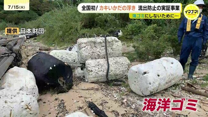 15日、広島市南区沖の瀬戸内海で新たな試みがスタートしました。いかだに取り付けているのは長さ1メートルほどの発砲スチロール製のフロートです。カキ養殖ではいかだひとつに30個ほどのフロートが取り付けられています。