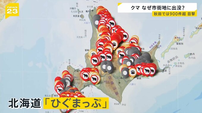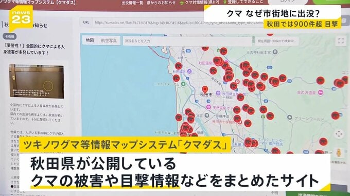 秋田県が公開しているクマの被害や目撃情報などをまとめた「クマダス」というサイトでは、北から南まで広範囲でクマが目撃されていることが分かり、ここ1か月の目撃情報や痕跡は900件以上にのぼっています。