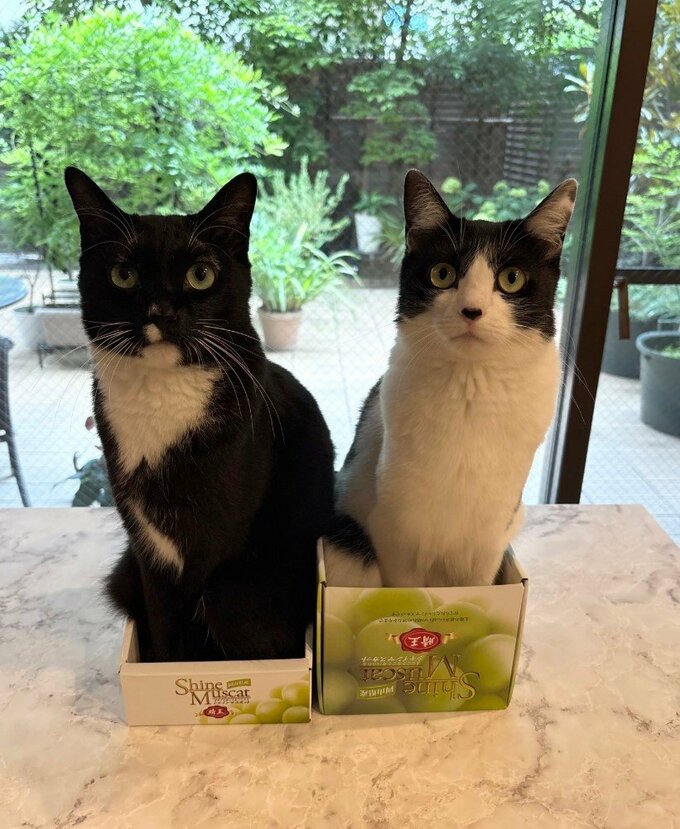 その箱とフタにフィットした感じで座り込み、すっくと身体を伸ばしているのは、まるで箱から伸びてきたかのような、藤さんの愛猫のマルとオレオ。2頭とも澄ましていて「何か?」と聞き返しているような表情です。