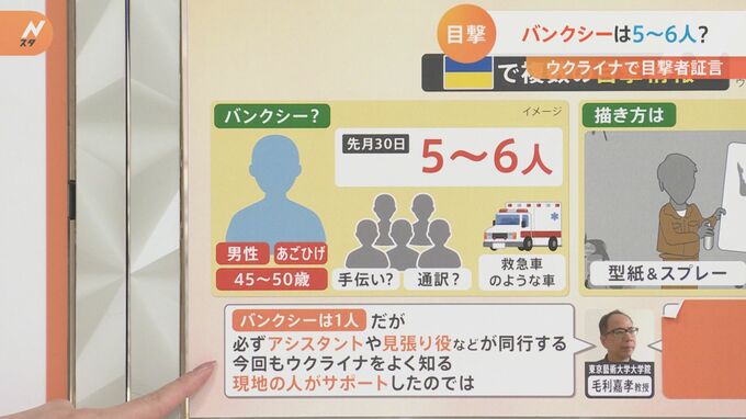 そして今回ウクライナではバンクシーの目撃情報が多数寄せられているんです。毛利教授によると、この10年、バンクシーはあまり目撃されていないそうです。今回は目撃情報があります。どんな姿だったんでしょうか?