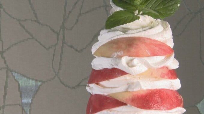 「ジューシーなモモを使っているので滑らないように頑張ってカットを工夫しながら積むようにこだわりました」