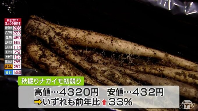 青森県十和田市で15日、秋掘りの土付きナガイモの初競りが行われ、今年8月の豪雨などの影響を受けて出荷数が減少し去年を上回る高値がつけられました。競りの音競り人の威勢の良いかけ声が飛び交う十和田地方卸売…