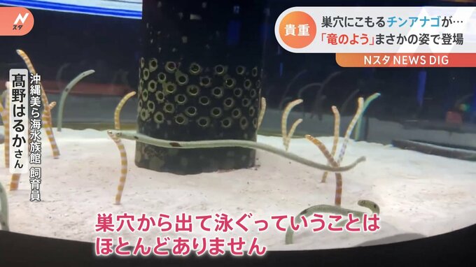 体の大半が砂の中にいるチンアナゴが優雅に泳ぐ姿が話題になっています。その理由を飼育員に聞きました。砂の中からひょろっと体を伸ばしているチンアナゴ。ご飯のときも体の大半は砂の中。恥ずかしがり屋さんなの…