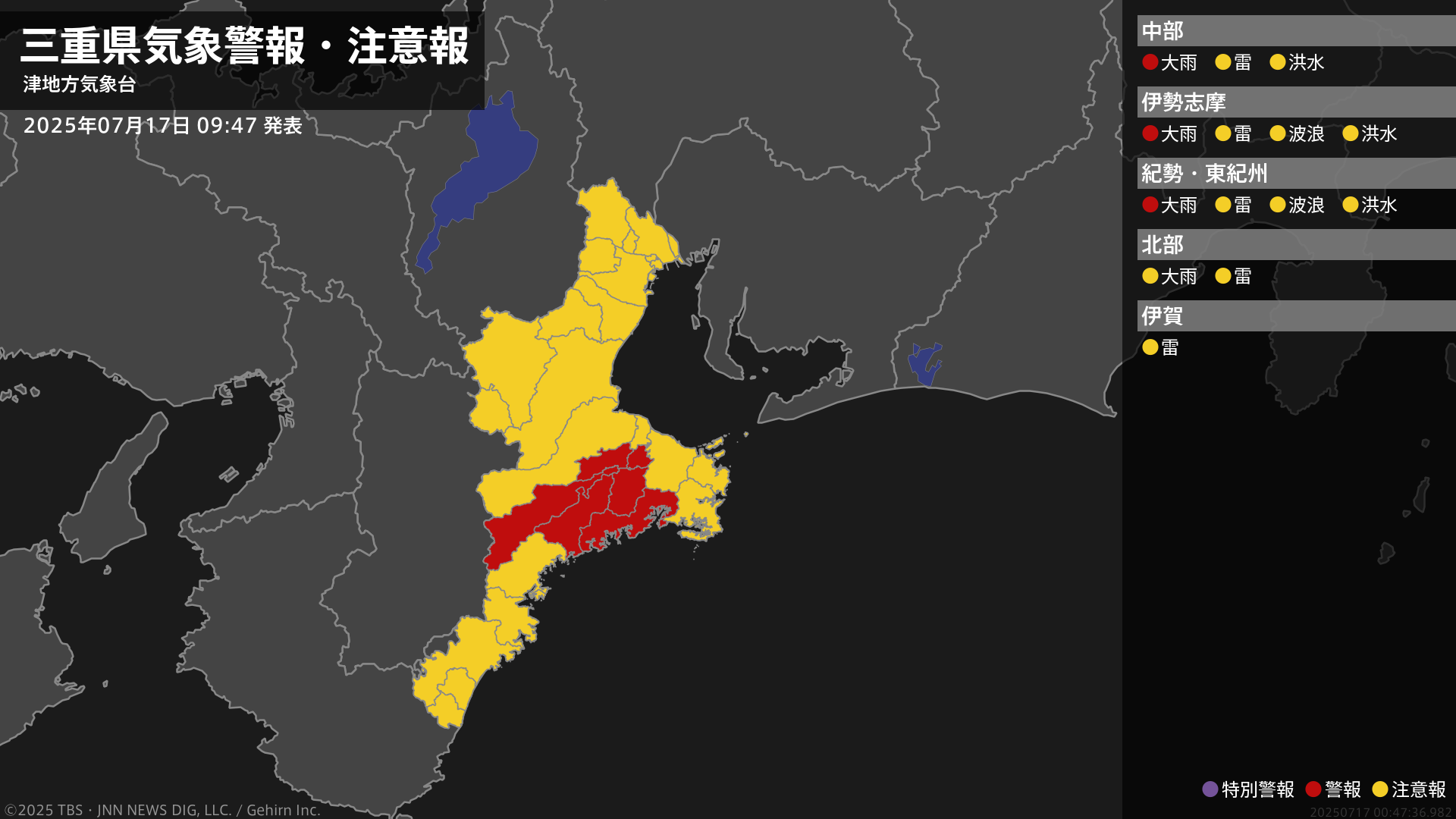気象台は、午前9時47分に、大雨警報(土砂災害)を多気町、大台町、玉城町に発表しました。