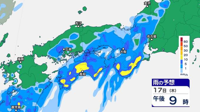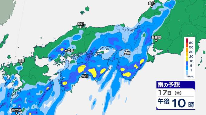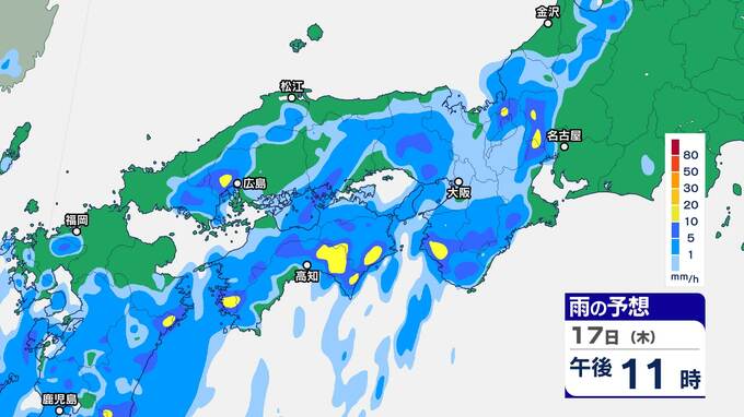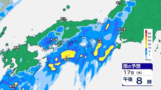 【大雨情報】近畿は17日夕方にかけて低い土地の浸水や土砂災害に警戒を 18日明け方にかけて局地的に雷を伴った『非常に激しい雨』が降る所がある見込み【雨のシミュレーション1時間毎】 チューリップテレビ 2025年7月17日(木) 11:31 国内 天気 17日(木)午後6時~午後11時 雨のシミュレーション