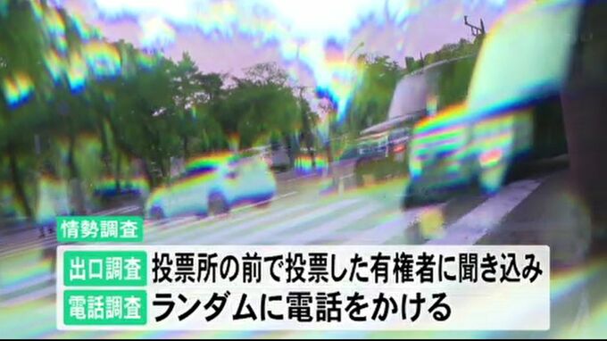 選挙の争点や候補者ごとの優勢、劣勢を判断するために、報道機関が行う情勢調査。投票所の前で実際に投票した有権者に聞き込みを行う出口調査や、ランダムに電話をかけて行う電話調査など、様々な手法で事前に有権者の意向を分析します。