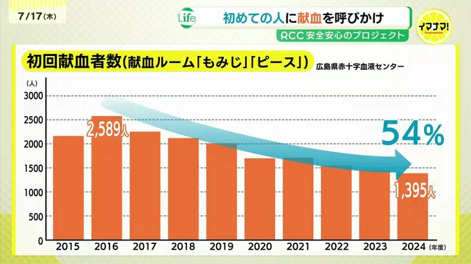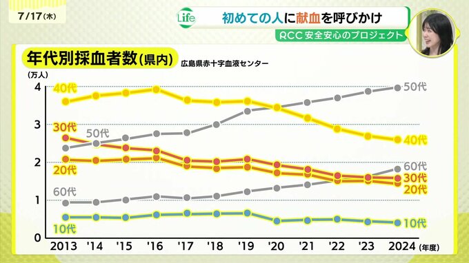 赤十字血液センターによりますと、2024年度、広島県内で献血したのべ人数は、およそ11万8千人。これは人口の4%なんですが、年代別に見ると、50代以上の人が増えているものの、10代~40代で減少しています。献血できるのは69歳まで、ということですから、若い世代が献血になじみがないと、これから先が心配…ということなんですよね。