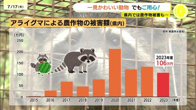 県によりますと、県内のアライグマによる農作物の被害額はおととしが106万円余りで、ここ数年は、ほぼ横ばいだということです。