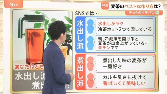 家庭での一般的な麦茶の作り方には大きく分けて『水出し』と『煮出し』があります。SNSではそれぞれの作り方について様々な意見があるようです。