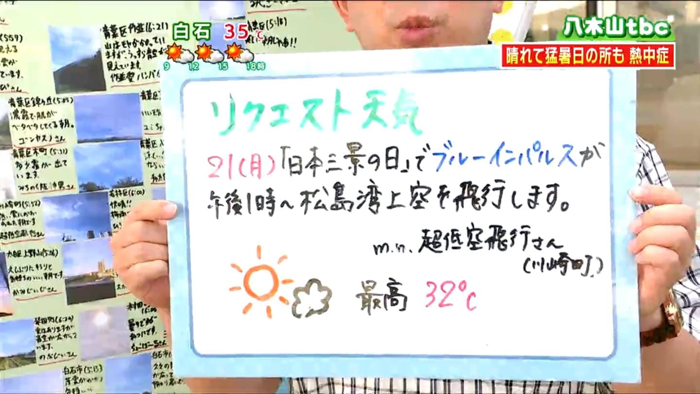 月曜日の「海の日」は、「日本三景の日」でもあり、松島湾上空でブルーインパルスの記念展示飛行が行われます。当日の松島は、概ね晴れて風も穏やかな予想で、美しい展示飛行を楽しめそうです。