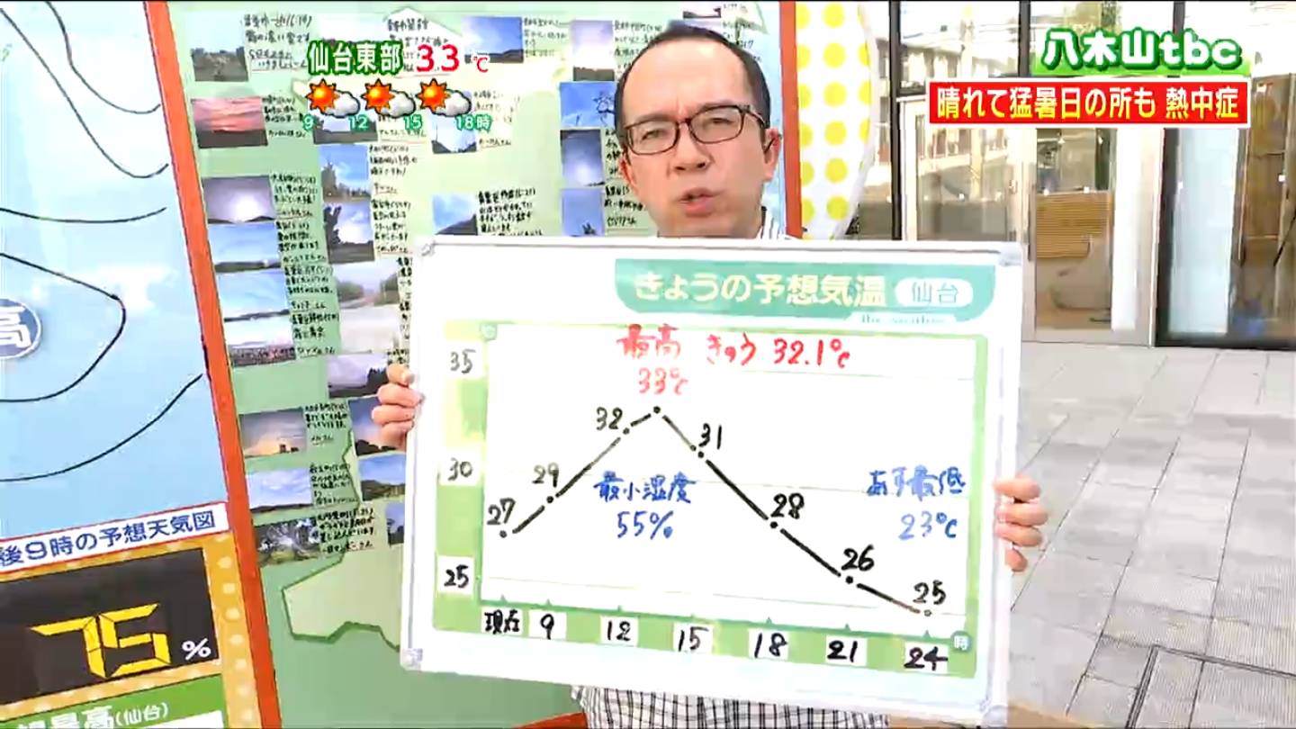 仙台の最高気温は33℃の予想。17日も32.1℃まで上がりましたが、17日と違って日中はずっと厳しい暑さが続く見通しです。17日は昼前後に26℃くらいまで下がる時間帯もありましたが、18日はそのような気温低下がないもようです。