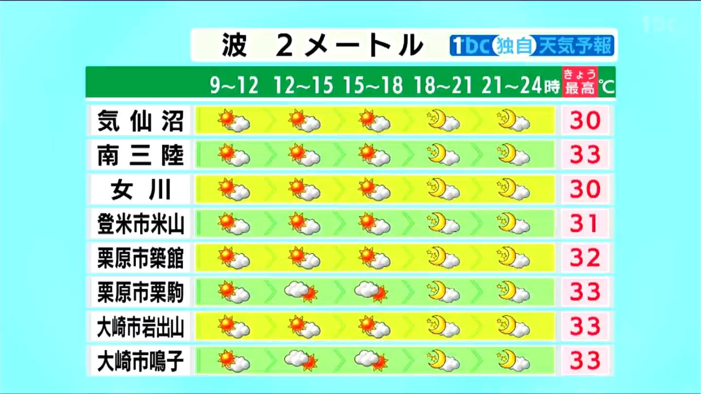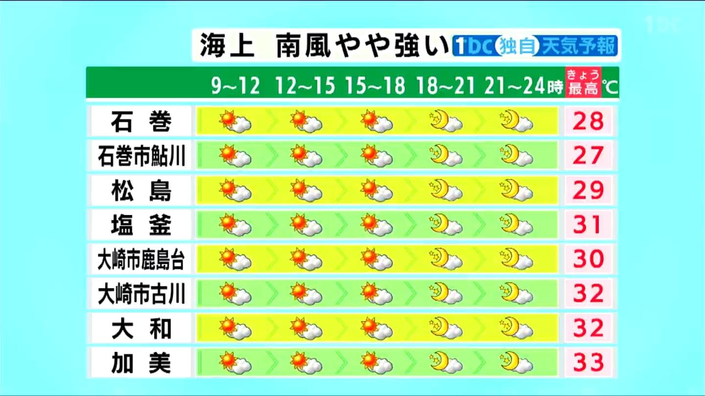 県内は広い範囲で30℃以上の真夏日となる見込み。予想最高気温は、白石と丸森で35℃と最も高く、仙台や南三陸では33℃、気仙沼でも30℃まで上がる見込みです。