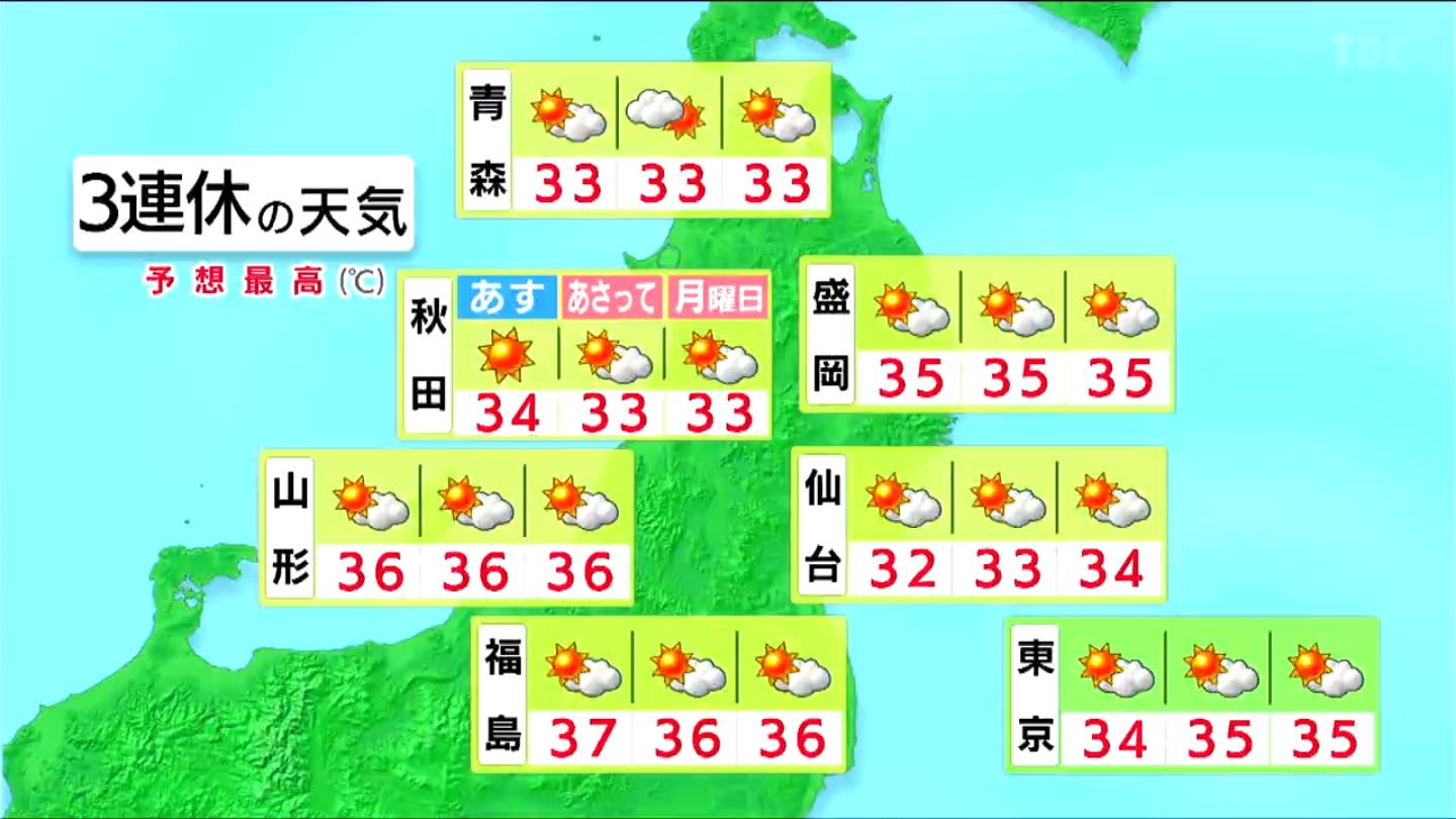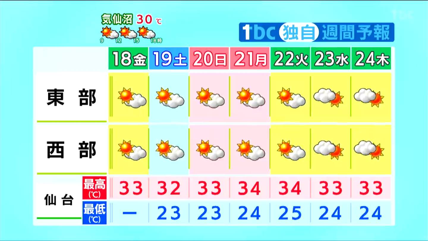 19日からの3連休も厳しい暑さが続きそうで、仙台の最高気温は3日間とも33℃前後の予想で、山形や福島では宮城以上の猛烈な暑さとなりそうです。
