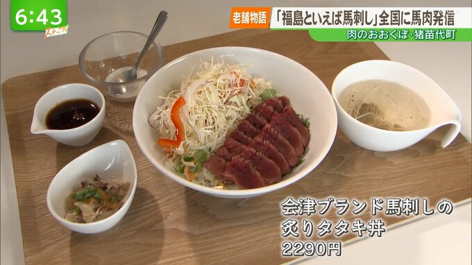 --大久保直哉さん(3代目)「お待たせいたしました、『会津ブランド馬刺しの炙りタタキ丼』になります。馬肉の“ブリスケ”という非常にうま味のある部位を炙ったタタキ丼になります。」