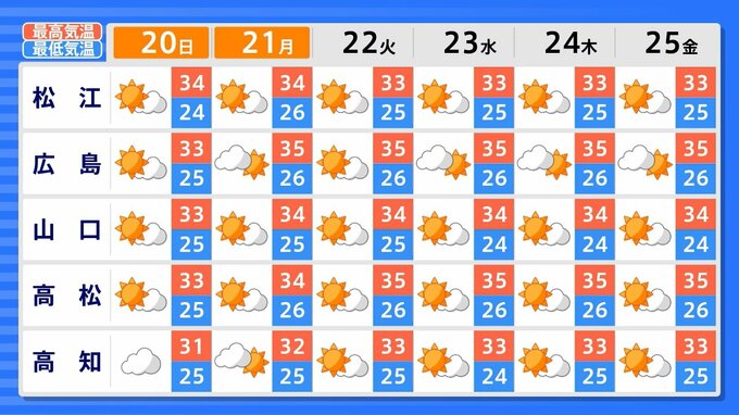 7月25日頃にかけ北日本、東日本、西日本では最高気温が35度以上の猛暑日に…気象庁が「高温に関する気象情報」発表 熱中症に警戒 名古屋・京都で37度予想 東京で36度続く予想… 山陰放送 2025年7月18日(金) 15:48 国内