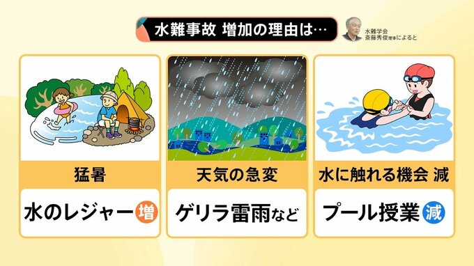 水難学会の斎藤理事によると、「猛暑の影響でプールの授業の中止が相次ぎ、事前の安全対策を受けないまま、水の中に入ってしまうことが原因に挙げられる」といいます。