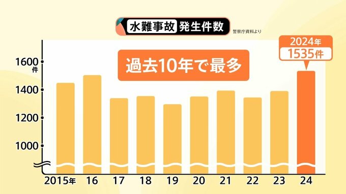2024年の水難事故の発生件数は1535件で、過去10年で最多となっています。(警察庁資料より)。
