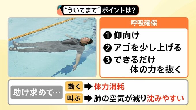 どうしても助けを求めたくなってしまいますが、動くと体力を消耗しますし、叫んでも肺の空気が減って沈みやすいという、負の連鎖に陥ってしまいます。