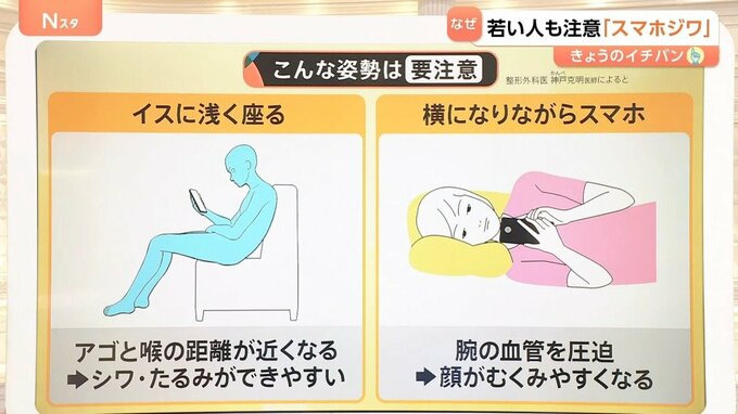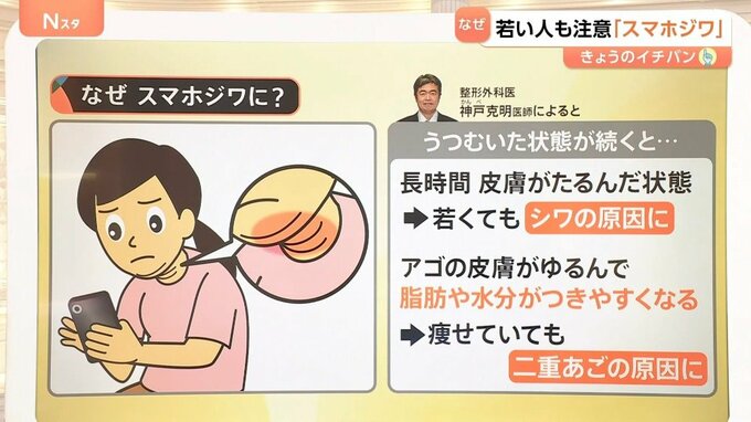 整形外科医の神戸克明医師は「うつむいた状態が続くと、長時間にわたり皮膚がたるんだ状態となり、若くてもシワの原因になりやすい。さらにアゴの皮膚が緩むことによって脂肪や水分がつきやすくなることから、痩せ型であっても二重アゴの原因になりやすい」としています。
