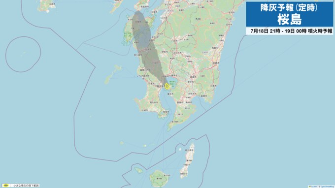 桜島で噴火が発生した場合には、18日21時から24時までは火口から北西方向向、19日09時から12時も火口から北西方向に降灰が予想されます。