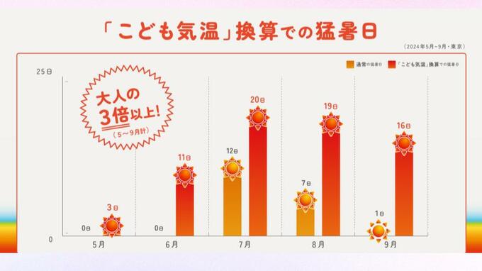 去年(2024年)の5月から9月までの東京における「こども気温」換算での猛暑日と通常の猛暑日との比較では、通常の猛暑日が20日であったのに対し、子どもの高さでは69日と、大人の3倍以上となりました。