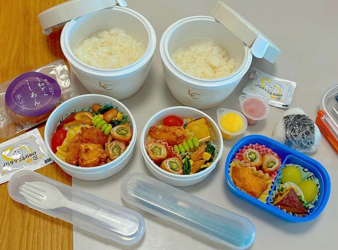 小倉さんは、「久しぶりに三人がお弁当でした」と、から揚げや枝豆、サツマイモやミニトマトなど、中身が詰まった色どり豊かな三人分のお弁当箱の写真を投稿。続けて「デザートは、長男はどら焼き 次男は凍らしたゼリー 三男はシャインマスカット それぞれが好きなものをデザートに入れたので、喜んでくれますように」と綴り、兄弟それぞれの好みに合わせてデザートを変えるという細やかな配慮を明かしました。