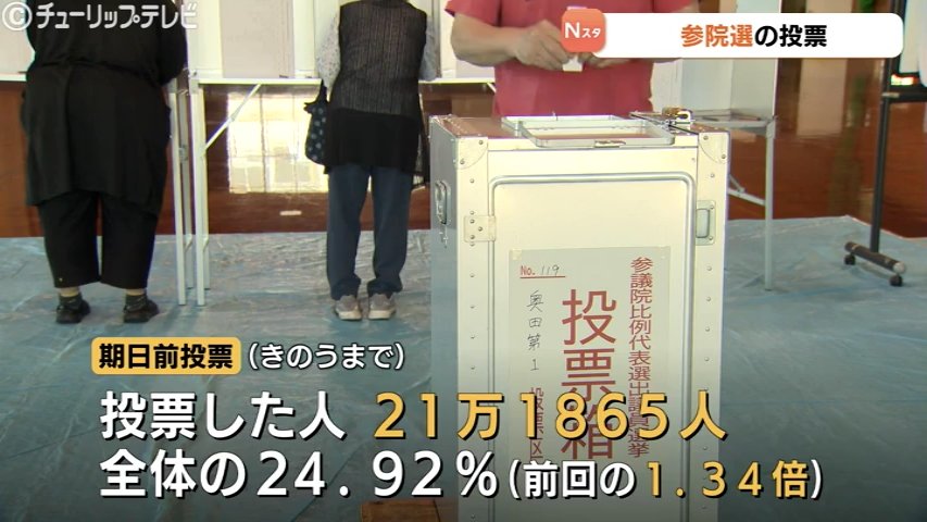また県内で期日前投票をした人の数は21万1865人で当日有権者数にしめる割合は24.92%となり前回の1.34倍となっています。