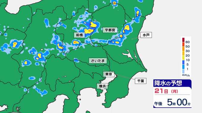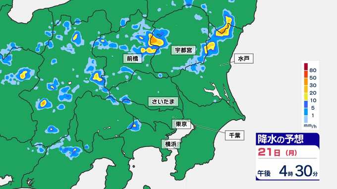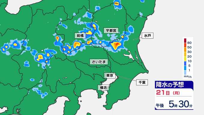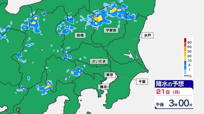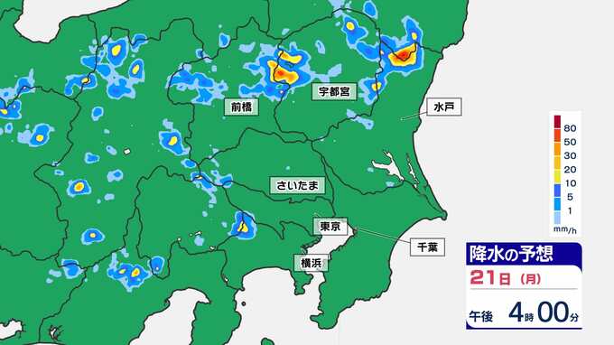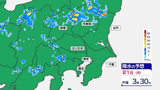 【東京首都圏 ゲリラ雷雨に注意】3連休最終日 非常に激しい雨のおそれ 雷の確率も高い【雨・発雷確率シミュレーション・警報の可能性がある地域】気象庁発表を詳しく 東京・神奈川・埼玉・千葉・群馬・栃木・茨城「大雨に関する気象情報 」 南日本放送 2025年7月21日(月) 14:00 国内 天気 21日(月祝)雨シミュレーション(30分ごと) 3連休最終日、特に山間部では天気が変わりやすく、上流で多くの雨が降り下流の河川が急に増水してしまうことが考えられます。山や川で過ごされている皆さんは、最新の雨雲の状況をチェックしておきましょう。