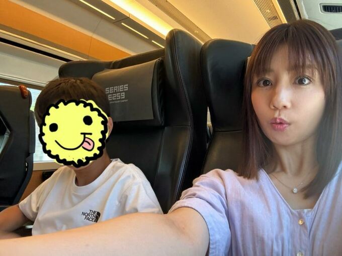 空港への移動中、電車内で2人きりの時間を過ごした小倉さん。「2人っきりのお出かけ貴重です」と特別な時間を大切にする気持ちを記しています。ただし現実的な親子の様子も垣間見え、「と言っても、電車の中で長男は漫画を読んでいるので私はブログを書いています」と冷静に伝えています。