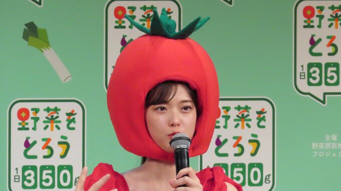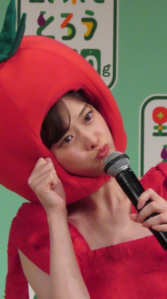 「さゆりんご」の愛称で親しまれている松村さんは、真っ赤なワンピース姿にトマトの被りものを被ってイベントに登場し、‟「さゆリコピン」です。きゅるるん”とあざと可愛く挨拶。