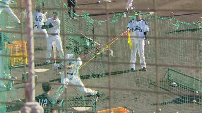 また、藤本監督は…選手をゴムで引っ張りながら打たせる練習。バッティングの時のバランスを整える狙いです。ほかの選手が難なくこなす中、野村大樹は…それでも何とかこなしていました。夕方のグラウンドには、バッティングの向上を目指し、居残りで、黙々とバットを振り込む三森の姿がありました。