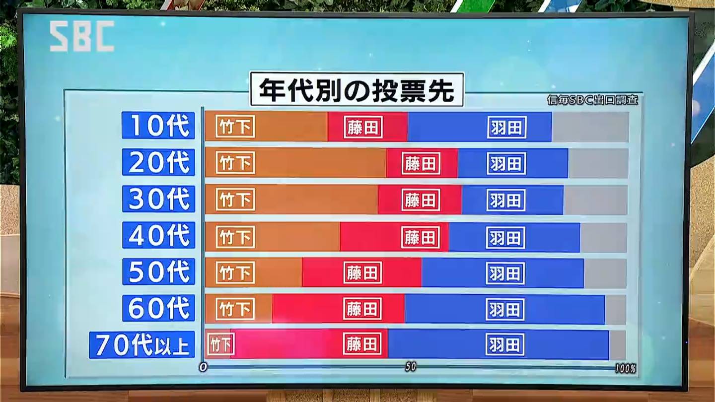 そのほかの調査ですが投票先を年代別に見ると50代から70代以上は羽田さんが最も多く、20代から40代は竹下さんが最多でした。