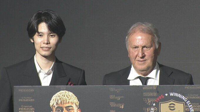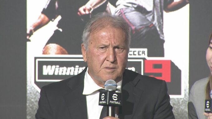 ジーコさんは「皆様、こんばんは」と日本語で挨拶。“「ウイニングイレブン」の表紙も何度か飾らせていただいて、光栄に思っています。監督時代も表紙を飾らせていただいてありがとうございました“と、自身と「ウイニングイレブン」の関わりに感謝しながら、“僕はビデオゲームがなかなか上達しないのが残念だけど“と、おちゃめに話しました。