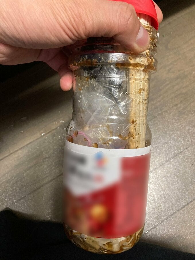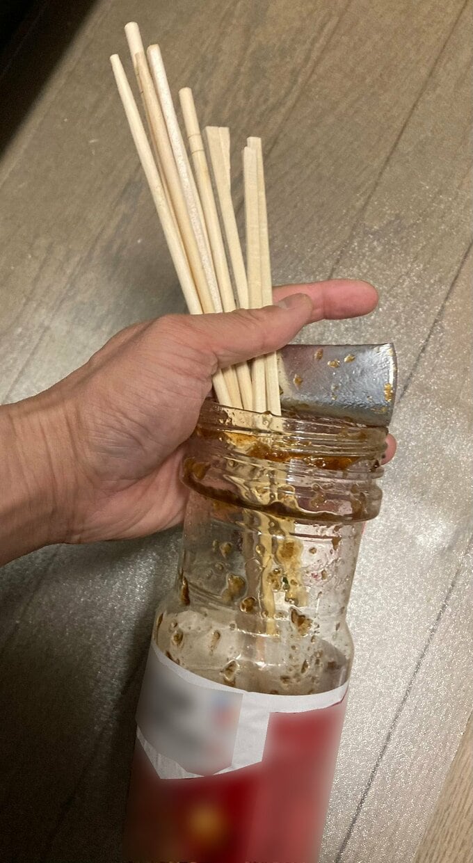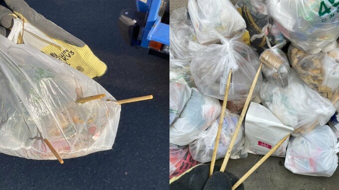滝沢秀一さんは、「可燃ごみを回収する時に、箸や竹串が飛び出すことがあるので、僕は汚れがひどい容器をそのまま竹串入れにして可燃ごみで捨てます。」と投稿。