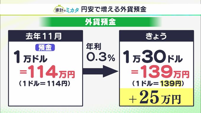 シリーズでお伝えしている「家計のミカタ」。3回目は「投資」について考えます、今回の数字は「25万円」。1年前に1万ドル分外貨預金していれば、計算上、家計の足しになった金額です。円安基調の波が個人投資家た…