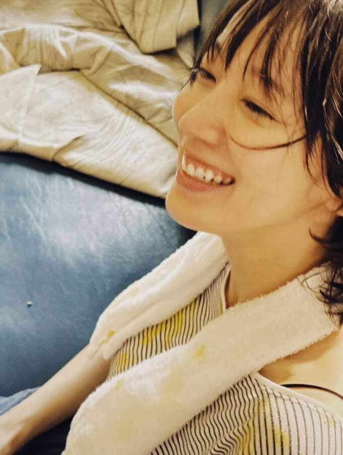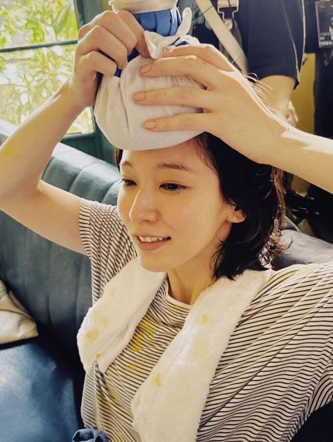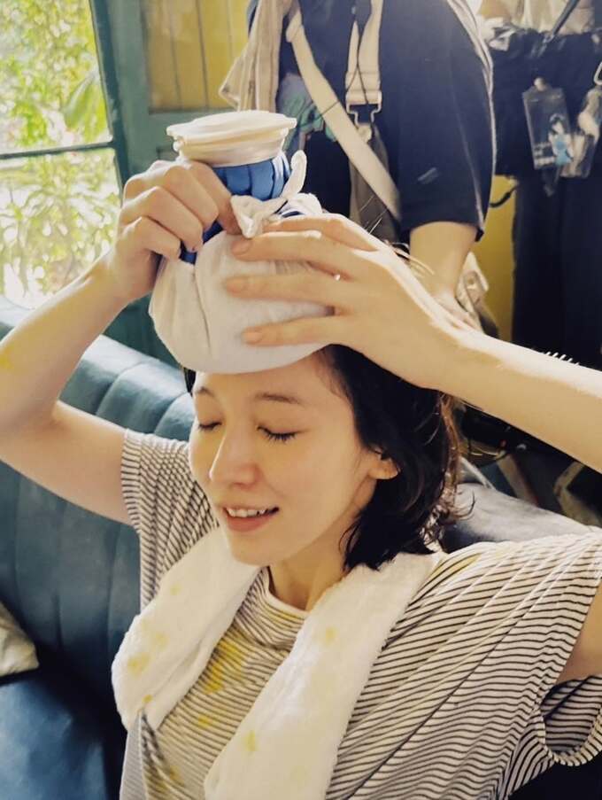 続く写真では、頭に氷のうを乗せて、ひとときの冷たさにうっとりしている模様。背後には撮影スタッフの姿も見えていて、オフショットであることが想像できます。吉岡さんは、映画の舞台挨拶があることを知らせていて、この写真はその映画に関わるものであるようです。