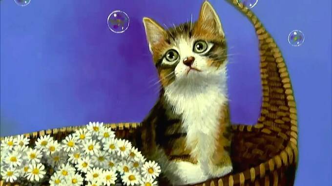 かごの中に入った可愛らしい猫が見つめるのは、シャボン玉。