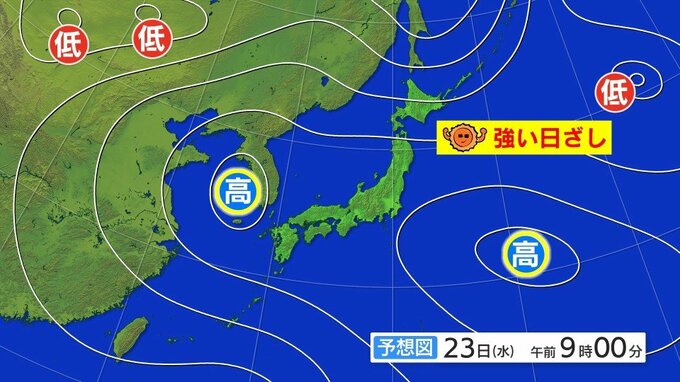 ■暑さの原因を23日朝9時の予想天気図で解説
