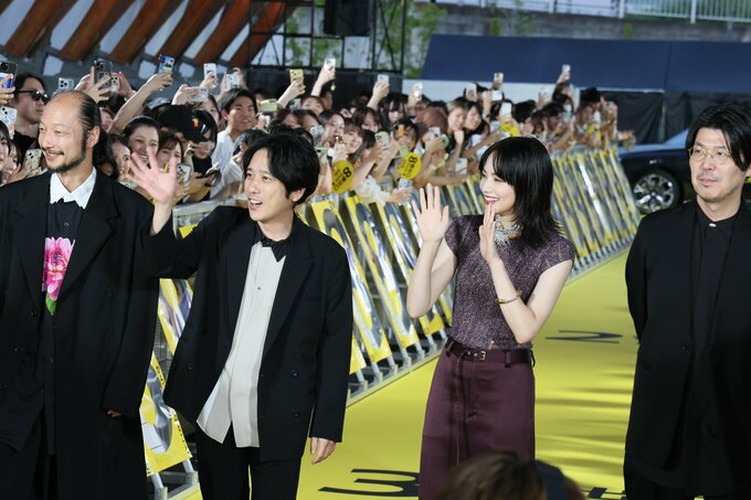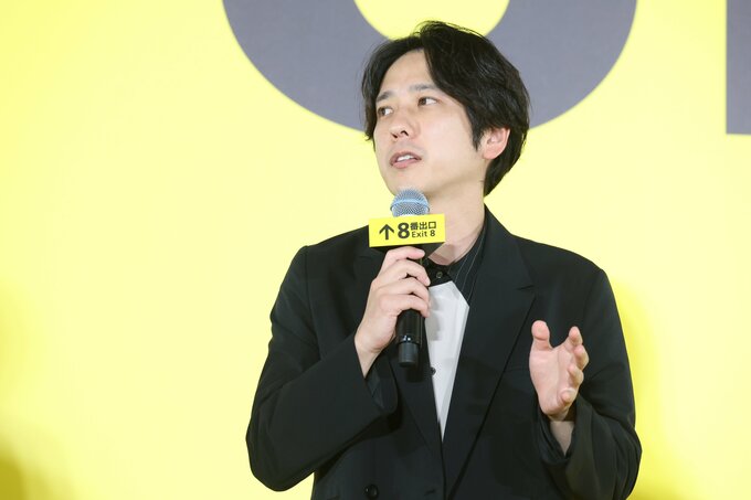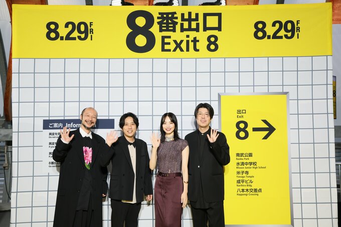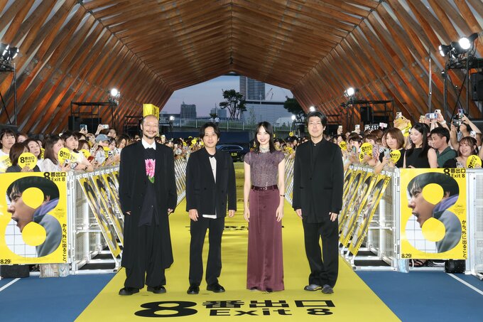 俳優の二宮和也さん、小松菜奈さん、河内大和さん、川村元気監督が映画「8番出口」88m無限ループカーペットアライバルに登場しました。