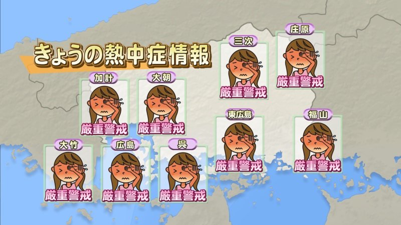 きょうも熱中症警戒アラートが発表されています。最高気温は35℃前後、危険な暑さが続く見込みです。午後は狭い範囲で夕立の可能性があります。熱中症に厳重に警戒して、無理をしないようにおすごしください。