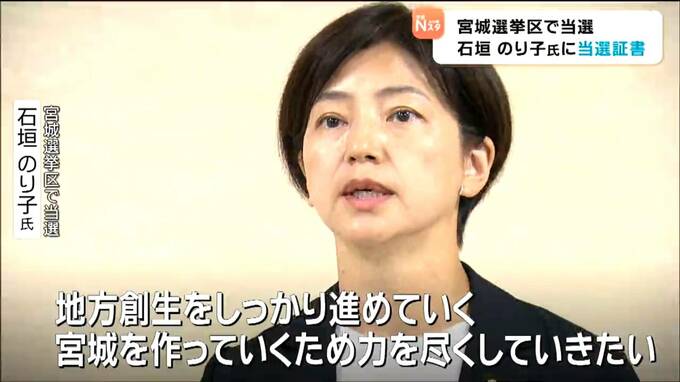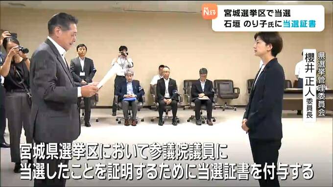 今月20日に投開票が行われた参議院議員選挙の宮城選挙区で2回目の当選を果たした立憲民主党の石垣のり子さんに23日、当選証書が手渡されました。石垣さんは党が掲げる公約の実現や地方創生を進めていきたいと抱負を述べました。