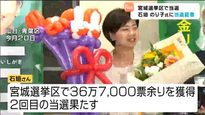 石垣さんは現職と新人、あわせて7人の選挙戦となった宮城選挙区で36万7000票余りを獲得し、2回目の当選を果たしました。