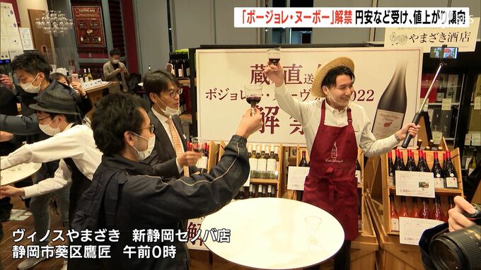 フランス産のワインの「ボージョレ・ヌーボー」の販売が11月17日解禁され、静岡市のワイン専門店では今年の味を一番に味わおうとイベントが開かれました。<店内での掛け声>「3.2.1ボジョレー」「サンテ(乾杯…