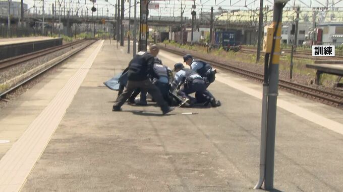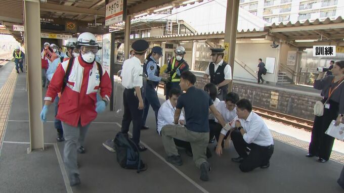 手には刃物…“通り魔”想定した訓練 警察が犯人取り押さえ 救急隊はトリアージ行う スポーツの祭典「アジア大会」に向け て 名古屋のJR笠寺駅