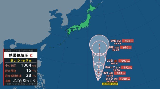 熱帯低気圧がマリアナ諸島をゆっくりと北北西に進んでいます。今後、12時間以内には台風に発達する見込みです。熱帯低気圧は中心気圧が1004ヘクトパスカル、中心付近の最大風速は15メートル、最大瞬間風速は23メートルとなっています。