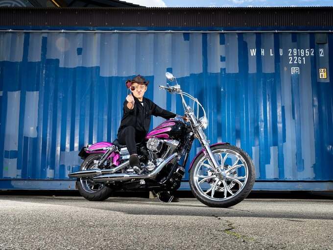 続けて「それにしてもいい笑顔 過去1番のいい写真が撮れちゃいました(親バカ発動)」と、ハンバーグ師匠の黒とメタリックピンクに塗装されたド派手なFXDL ダイナ ローライダーにまたがり、ご満悦なベビバーグの笑顔に思わず、蜂谷さんも親バカ発動の連写モードで最高の表情を連続掲載