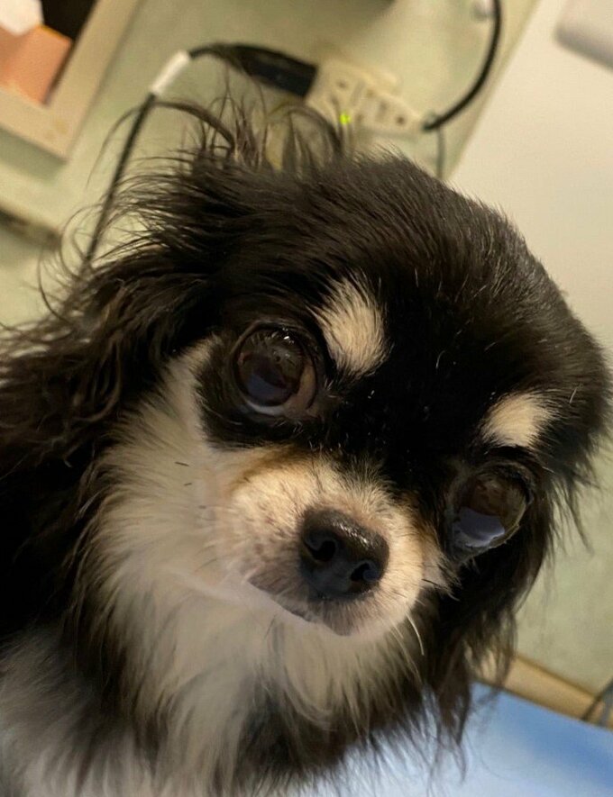 小柳さんは、初めて出会った頃のルルの写真を投稿。「あの愛くるしいルルの表情とは全く違います」というルルは、目尻が上がり口角が下がって緊張した面持ちです。
