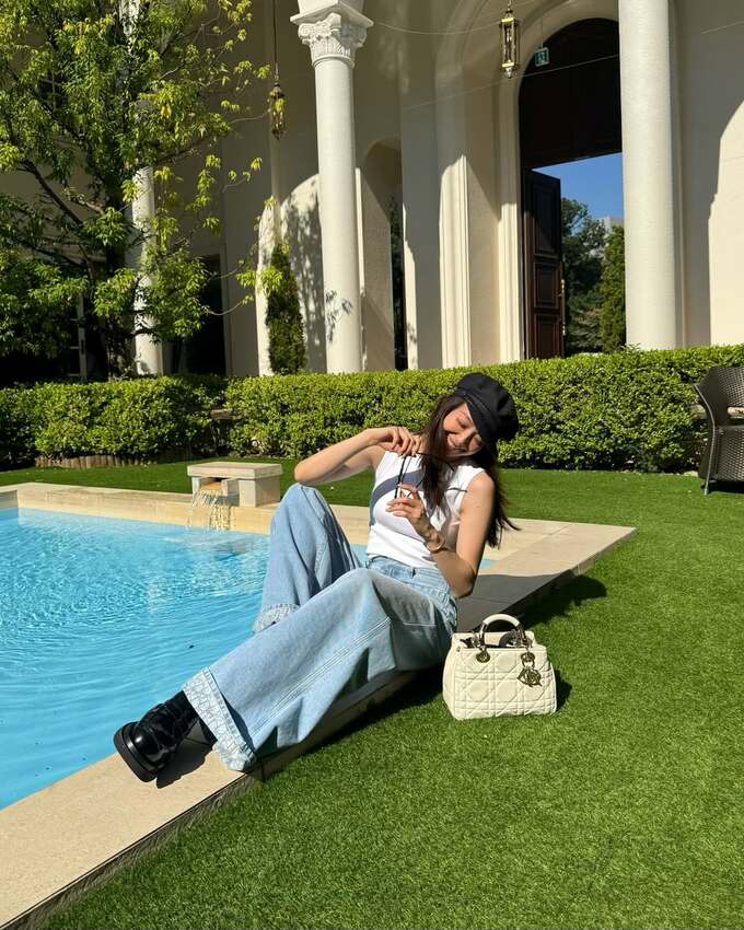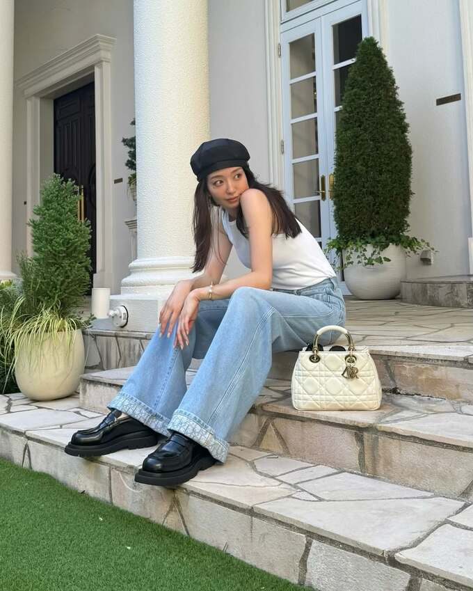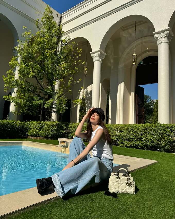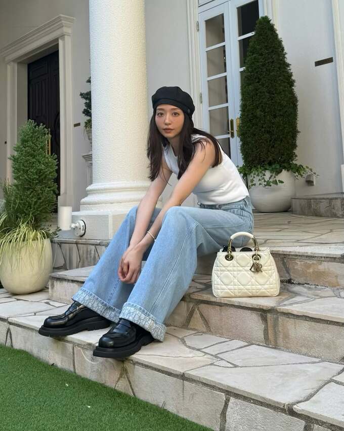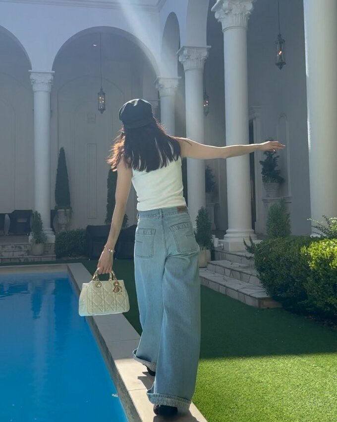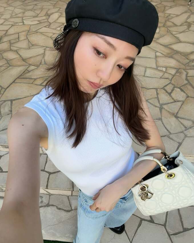 投稿された写真で松島さんは、プールサイドで白いタンクトップとデニムのワイドパンツという夏のカジュアルスタイルで、黒いベレー帽と靴で引き締めたコーディネートを披露しています。