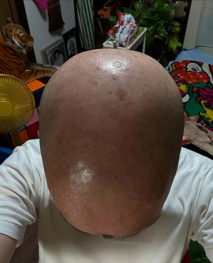 坂本ちゃんは「体重90キロから20キロ減のダイエットは出来たけれど」と、健康を志してやり抜いた現状を振り返りつつ、「頭髪を増やすことは出来ない私。」「だって毛根がなーい笑」と、嘆きの頭頂を自撮りしています。
