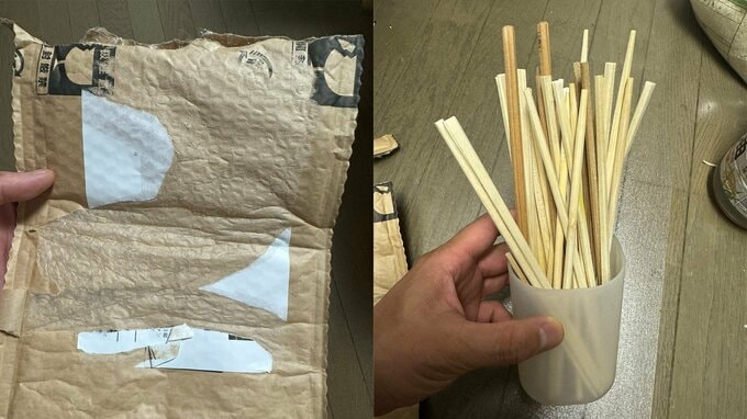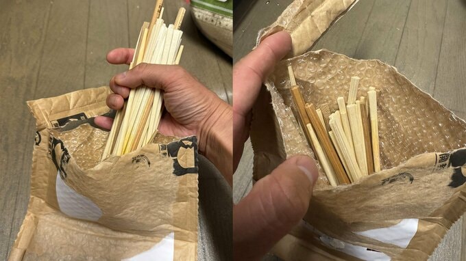 滝沢秀一さんは「ネットショッピングで送られてくるプチプチ入りの封筒は古紙に出せないので、割り箸入れにすると便利ですよ!」と投稿。